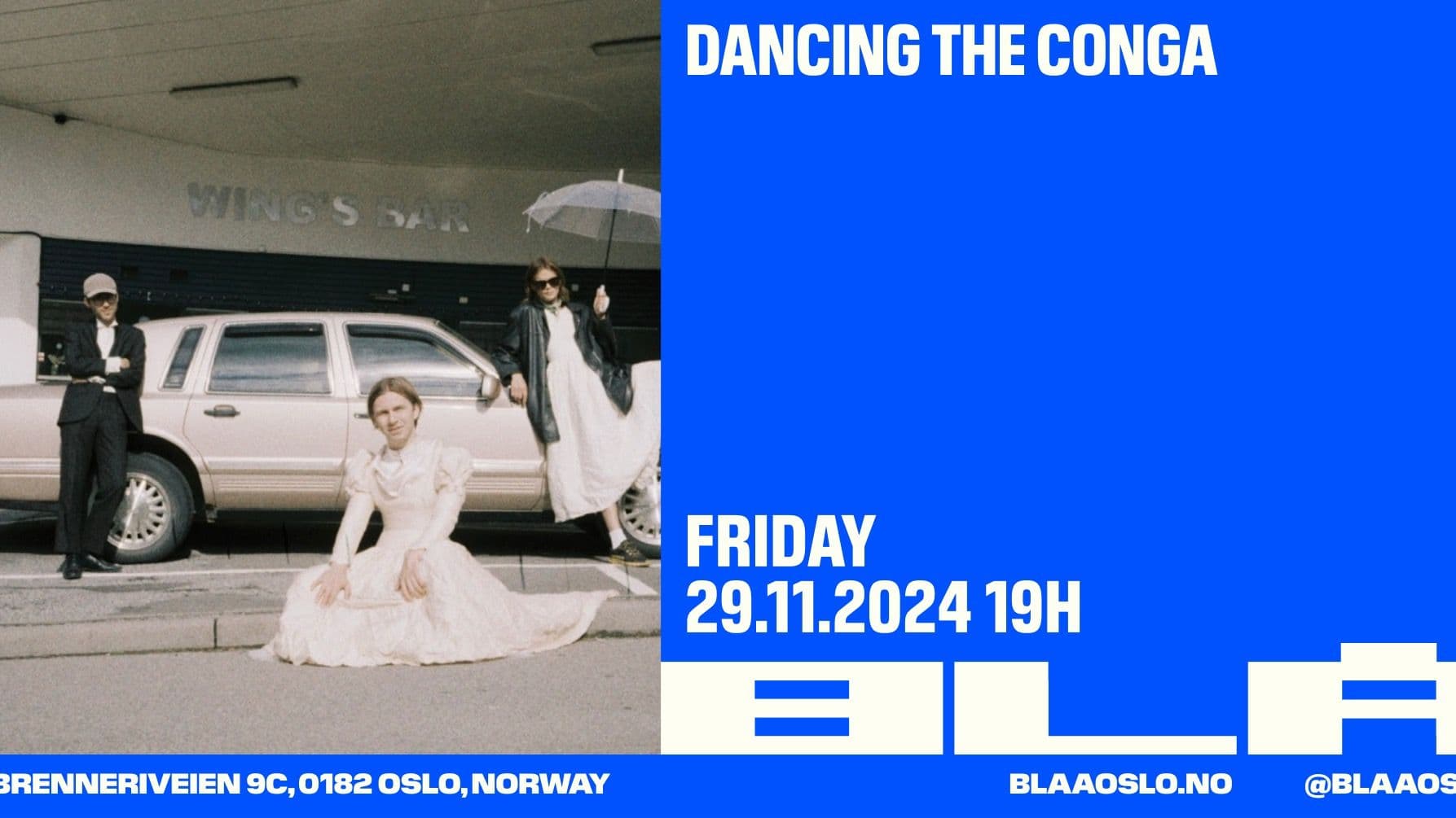 For Dancing the conga skjer kompromisser i vennskapets navn, og når trommene på debuten dundrer på er det ikke med sterkt volum og et ønske om å hevde seg, men heller som et forsøk på å løfte nærmeste nabo til nye høyder. På den måten gir musikken et innblikk i newpunkens verden, hvor vennskapet trumfer alt og det sterke og sårbare står side ved side. Debutalbumet "Trying to define new punk" ble utgitt i 2023, og med sanger som "I carry my umbrella like a gun", "the car" og "brexit girl", beviste trioen at de er blant de mest unike og banebrytende norske indie-bandene akkurat nå! Bandet er kjent for sin svært joviale scenetilstedeværelse, og har spilt en rekke festivaler i sommer, fra Træna til Fres, og nå er trioen klare for å innta Blå.