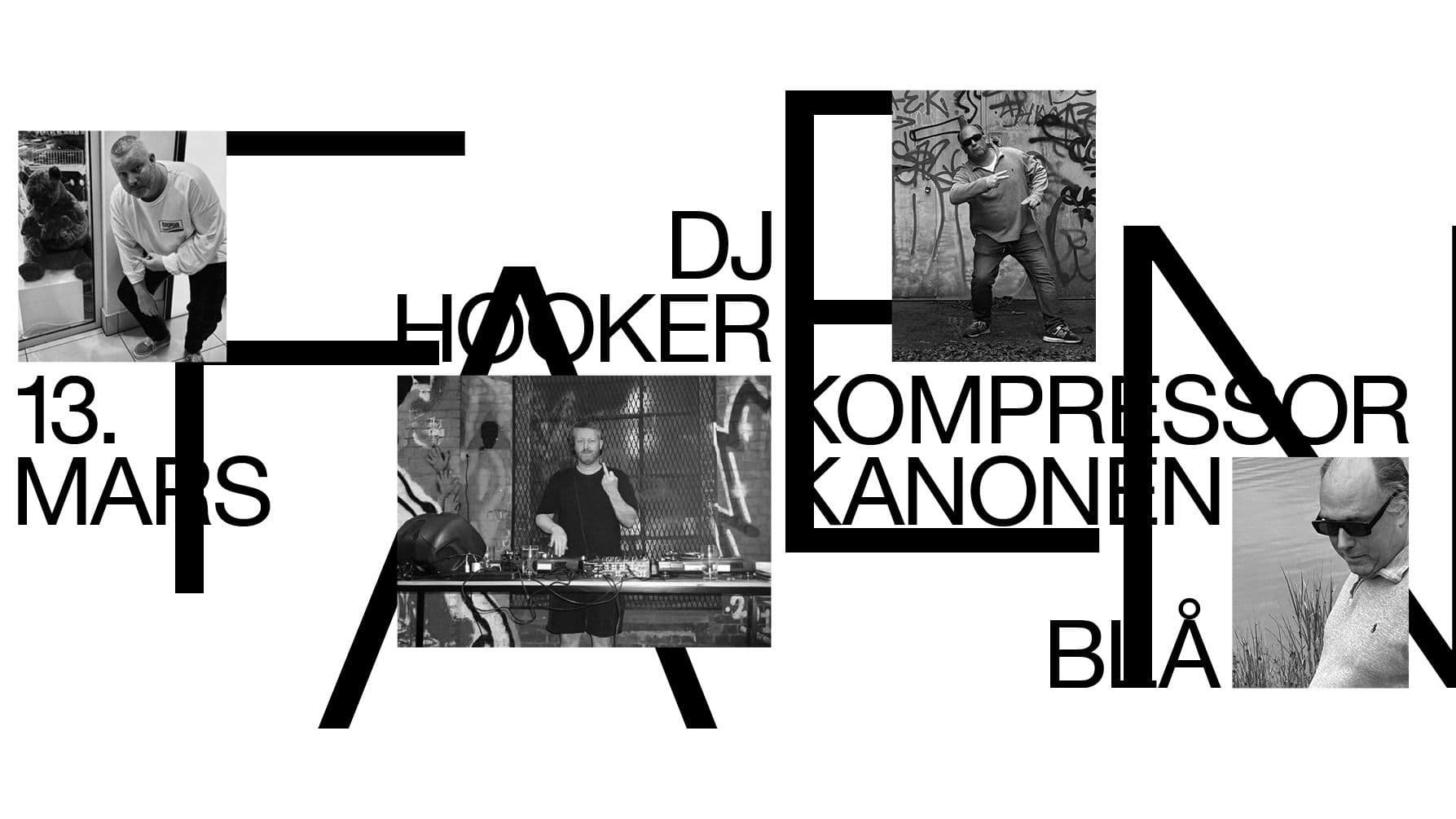 DJ Hooker revitaliserer sitt FAEN! konsept og inviterer med kompis, levemann og techno-mogul, Kompressorkanonen for denne fredag den 13de. De går langt tilbake i Oslos og landets klubbscene og har delt platespillere med hverandre siden legendariske Heartattack fester, HMD og glory days på Kafe Hærverk & Mir.