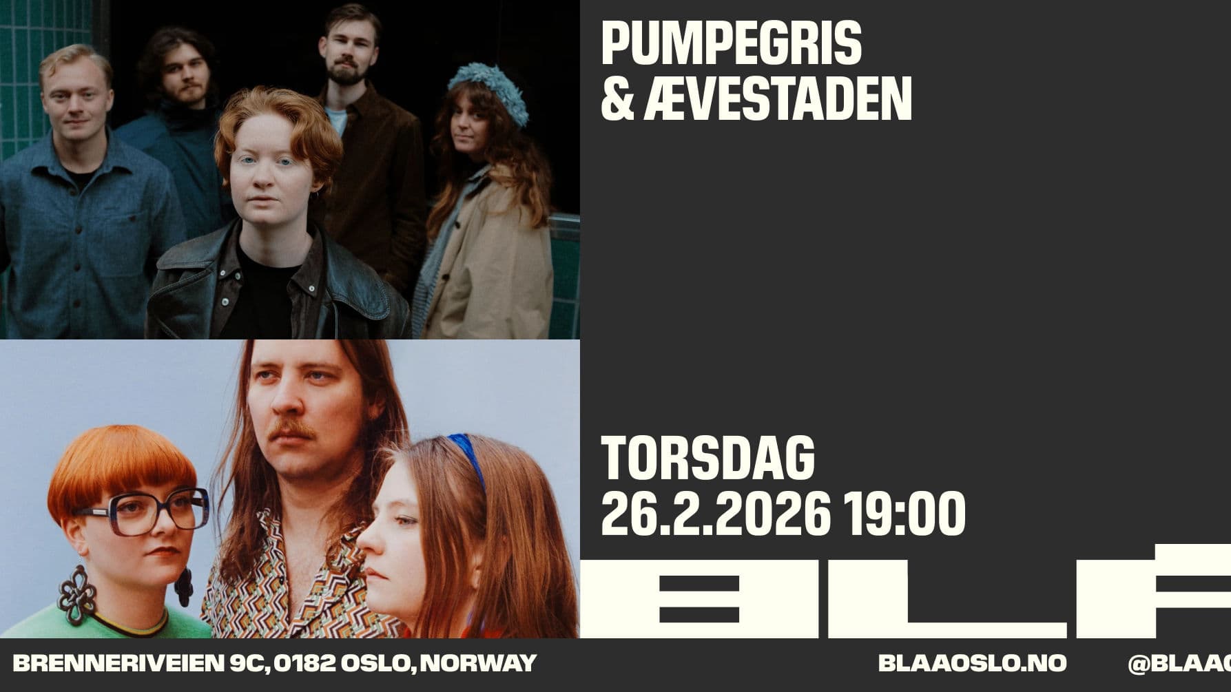 BLÅ fyller 28 år, og for å åpne bursdagshelgen vår inntar to av landets mest særegne og sjangersprengende band hovedsalen vår: Pumpegris og Ævestaden.