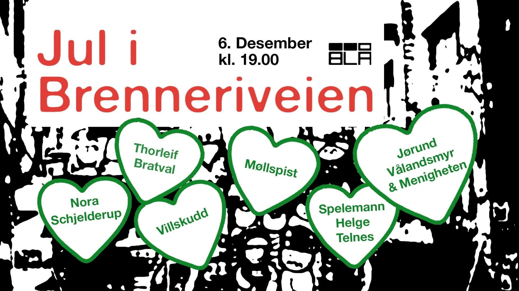Juleselskapet du alltid har drømt om daler ned på BLÅ i år. Det blir JUL I BRENNERIVEIEN med nisser, troll og rock n' roll. Visesang, spelemann og disco-dub. En herlig blanding harde & myke pakker under grana. Du trenger ikke mer ujulete jule jul enn dette her. Det brygger opp til selskap! Blås i ribbe og pinnekjøtt, der finnes sprit og øl. Kom deg ut av stallen, det er plass på herberget. Jul i Brenneriveien presenterer Jørund Vålandsmyr & Menigheten, Villskudd, Møllspist, Spelemann Helge Telnes, Thorleif Bratval og Nora Schjelderup, med helt spesielle gjester som ikke akkurat har vært snille i år.