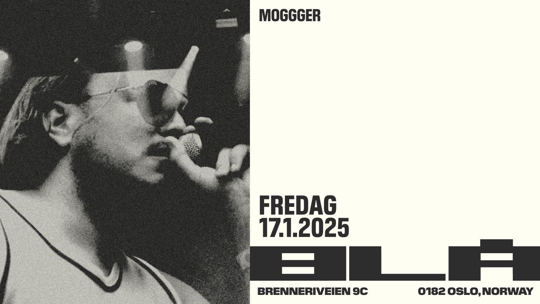 Moggger er en levende legende som er godt etablert både som grafitti-king og rap-mogul i hiphopmiljøet her til lands. Med sine tunge og emosjonelle trademark produksjoner pluss sine enkle og catchy tekster har han over de siste ti årene rukket å bli en respektert figur, både som produsent og rapper på tvers av sin egen diskografi og i samarbeid med artister som Lars Vaular, Cezinando, King Skurk One, Tøyen Holding, Lil.Lørda, Yoguttene, B-boy Myhre, Angelo Reira, Martin Hazy, Tøyen 501 - og sist men ikke minst - den Moggger-orkestrerte supergruppa 612 med T_boyofficial, Lille Leon og Bønna. Han er nå aktuell med den to nye solo slipp: "Ingenting å bevise" og "Ingen forklaring" som slapp for et par uker siden. Han tar med seg en haug gjester og inviterer til konsert på BLÅ fredag 17. januar