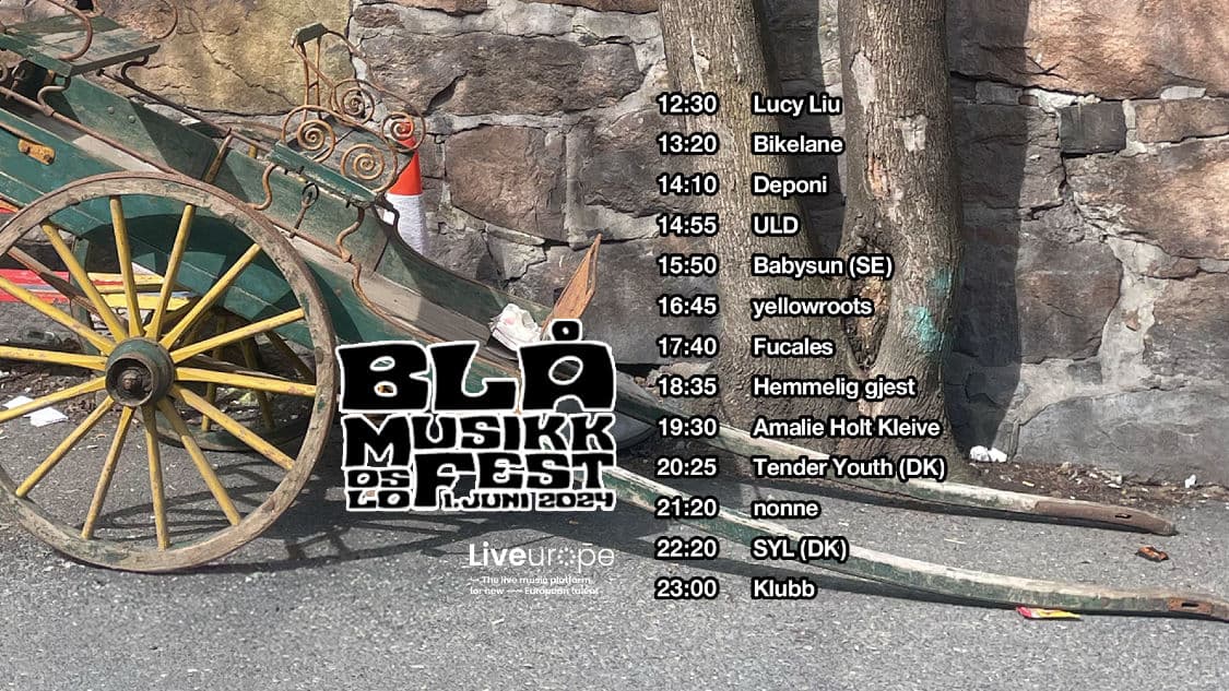 Program: 12:30 LUCY LIU 13:20 Bikelane 14:10 Deponi 14:55 ULD 15:50 Babysun (SE) 16:45 Yellowroots 17:40 Fucales 18:35 (Hemmelig Gjest) 19:30 Amalie Holt Kleive 20:25 Tender Youth (DK) 21:20 Nonne 22:20 SYL (DK) 23:00 Bjørn Torske