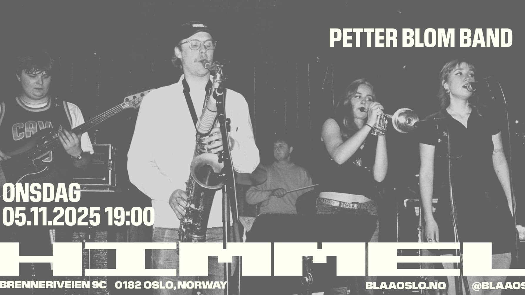 Petter Blom er en produsent og trommis fra Bergen som med fullt band sømløst syr sammen sjangrer som hiphop, jazz og neo-soul til et unikt og organisk lydbilde. I fjorårets debutalbum "Unboxed" beviser han ved å kombinere vokallåter og instrumentale spor, og ved å invitere inn vokalister, rappere og instrumentalister, at den musikalske reisen Petter Blom Band inviterer oss til appellerer till jazzelskere, så vel som de som interesserer seg for hiphop og moderne soul. Nå tar Petter med seg albumet og gjør det live på Himmel med en håndfull av byens talentfulle musikere: Sigurd Lie Søvold - Keys Aksel Rønning - Sax Eira Elise Øverås - Trompet Elias Løstegaard - Bass Petter Blom - Trommer Benjamin Rø Haavelsrud – Gitar