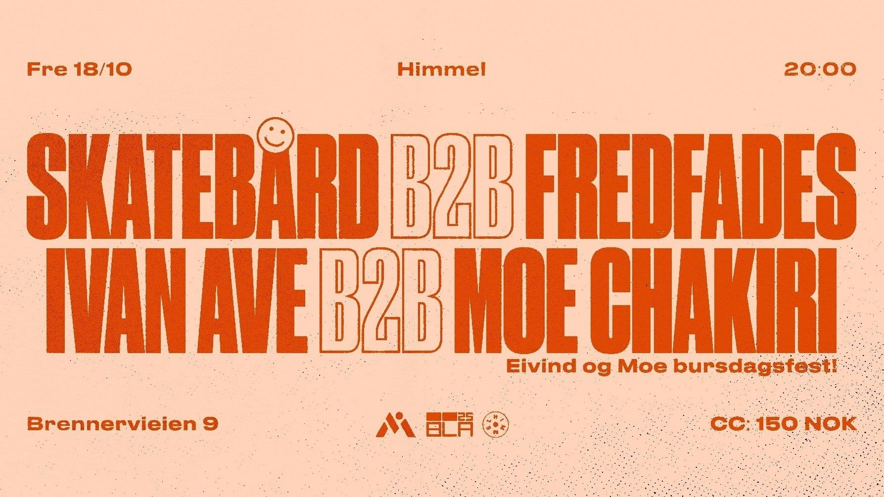 21:00-00:00 Ivan Ave B2B Moe Chakiri + dobbel bursdagsfest! Eivind og Moe sin felles interesse for jazzy og sjelful klubbmusikk fra 1970-2000 tallet har tatt både dem og platesamlingen deres rundt på de fleste klubbene i byen som har eksistert siden de glade dagene de startet å spille sammen på Turkish Delight. En kveld kan gå fra Black Jazz og Idris Muhammad, til Slum Village og Madlib, til klassisk Deep House, eller til Neptunes produksjoner, Lucy Pearl og Kaytranada. 100% garantert topp stemning - kom tidlig for å ta en øl og fiere gutta før de spiller.